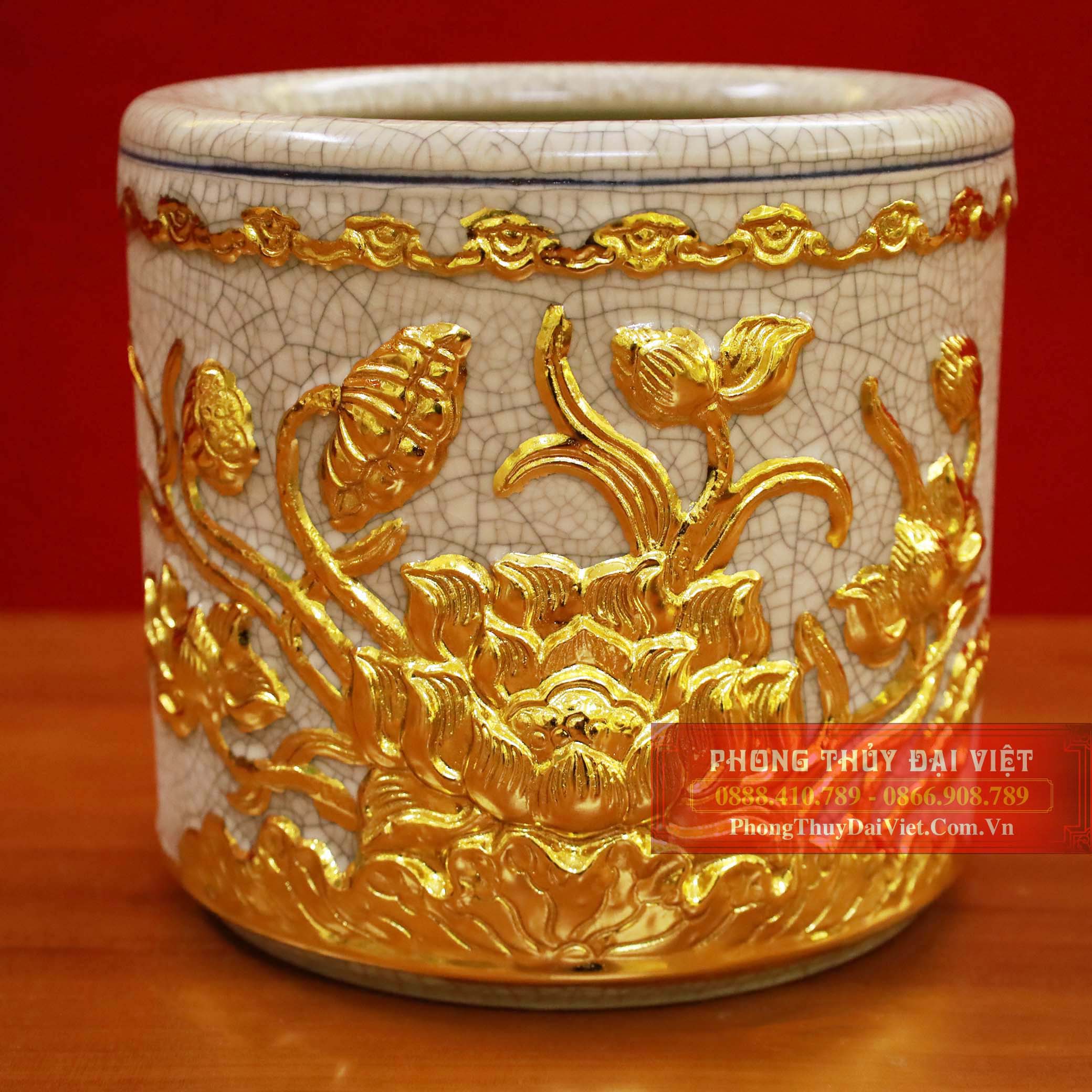 Bát hương sen men rạn đắp nổi dát vàng 24k cao cấp kèm đế