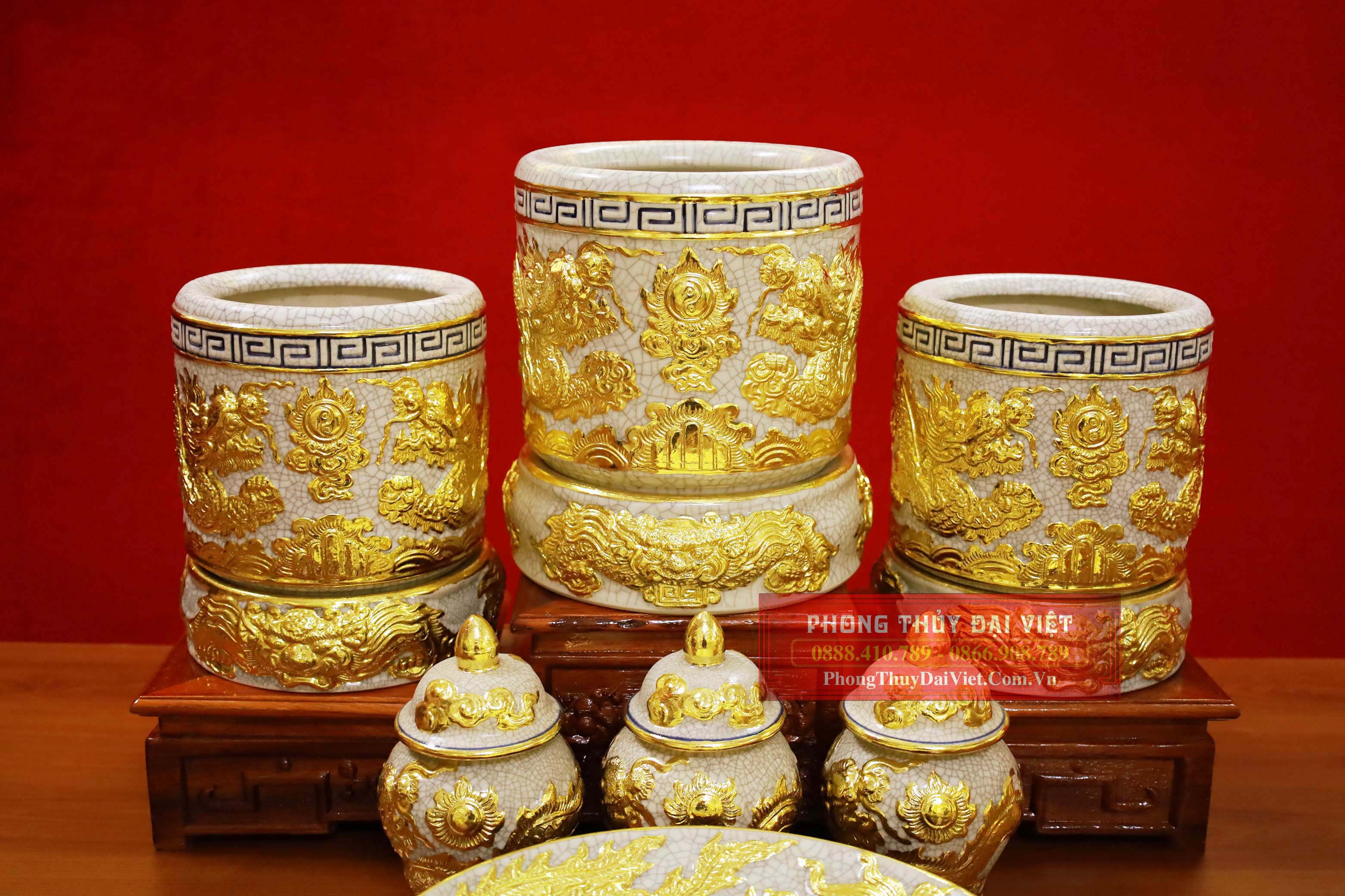 Bộ đồ Bát Tràng men rạn đắp nổi dát vàng 24k cao cấp
