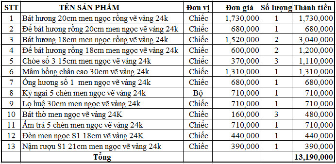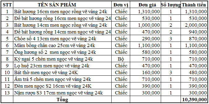 Bộ đồ thờ men ngọc vẽ vàng 24k- ban gia tiên và thần linh - VV01