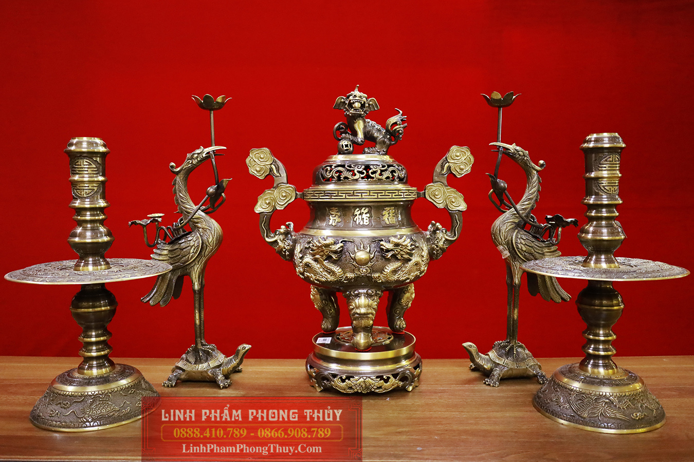 + Bộ sản phẩm bao gồm: 1 bộ đỉnh rồng, 1 cặp hạc và 1 cặp chân nến hoa văn