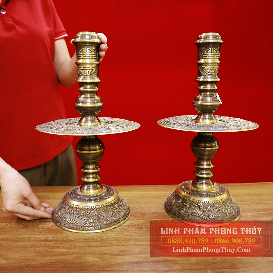 Cặp chân nến tượng trưng cho âm dương, có hình bát úp với hoa văn sắc nét được thiết kế một cách vững chãi. Phần đế của cặp nến là chi tiết tứ linh: Long, lân, quy phụng hội tụ giúp trấn trạch, ngăn chặn tà khí xâm nhập và mang đến may mắn, bình an cho gia đình.Trên bề mặt của chân nến xuất hiện những chi tiết long phụng sum vầy với đường nét uyển chuyển, xoay quang đường tròn ở giữa với ánh hào quang tỏa rộng tạo thành thế hồi long hướng nhật. Phần trên đĩa nến là hình chữ Thọ mang ý nghĩa trường thọ và viên mãn. Đây cũng là bộ phận thay thế cho một cây nến khi thờ cúng.
