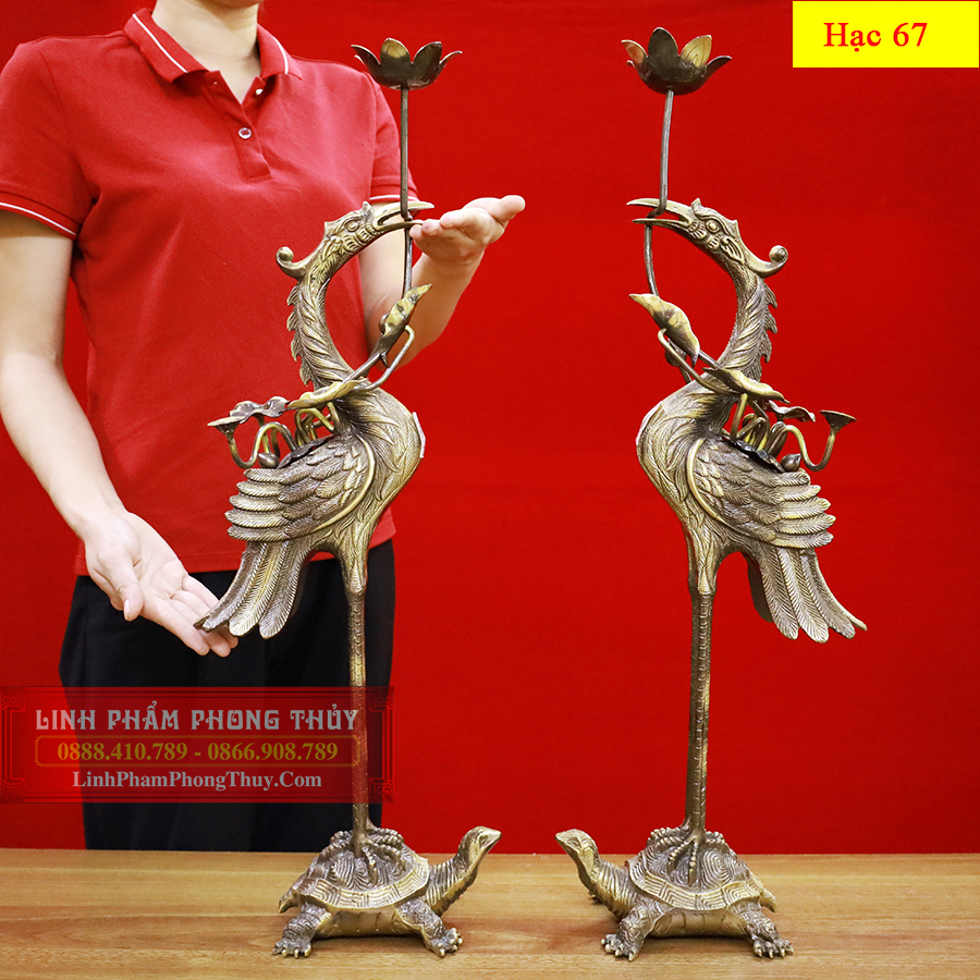 Đôi hạc ngự trên lưng rùa, mỏ ngậm cành sen với các đường nét thanh mảnh, uyển chuyển. Bộ lông vũ và phần đuôi của hạc được khắc họa đầy truyền cảm, tạo nên sự thanh cao. Chân hạc khẳng khiu, đứng thẳng, đầu vươn lên cao. Trưng bày cặp hạc trên ban thờ gia tiên sẽ giúp gia chủ cũng như các thành viên trong nhà nhận được những điều tốt đẹp và may mắn.