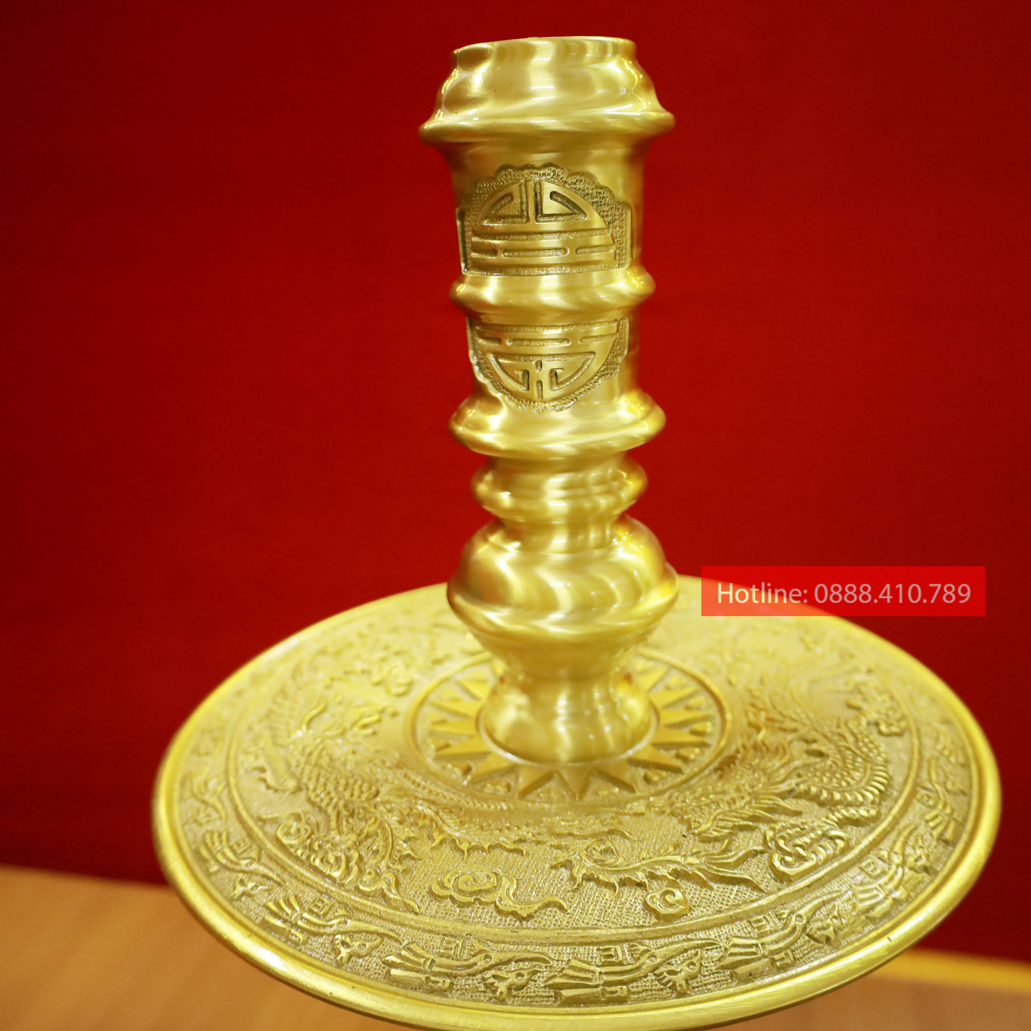 Cặp chân nến tượng trưng cho âm dương, có hình bát úp với hoa văn sắc nét được thiết kế một cách vững chãi. Phần đế của cặp nến là chi tiết tứ linh: Long, lân, quy phụng hội tụ giúp trấn trạch, ngăn chặn tà khí xâm nhập và mang đến may mắn, bình an cho gia đình.Trên bề mặt của chân nến xuất hiện những chi tiết long phụng sum vầy với đường nét uyển chuyển, xoay quang đường tròn ở giữa với ánh hào quang tỏa rộng tạo thành thế hồi long hướng nhật.