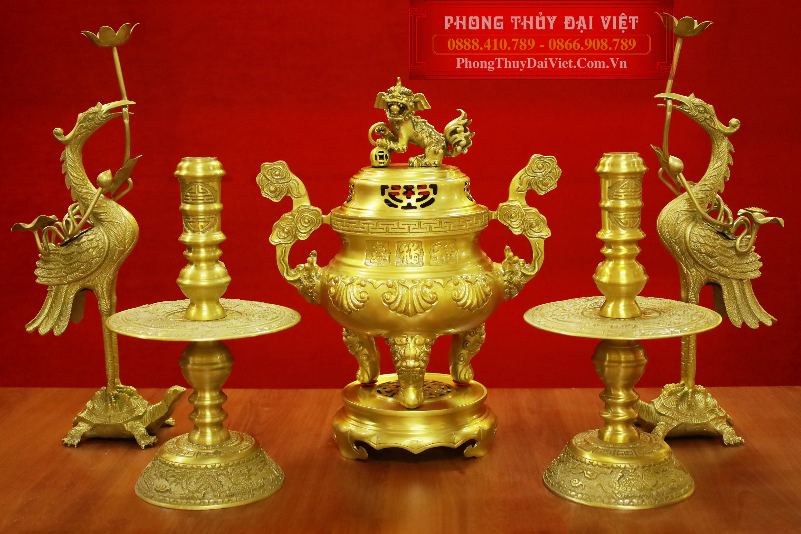 Bộ ngũ sự bao gồm 1 Đỉnh đồng, 2 hạc và 2 chân nến.
