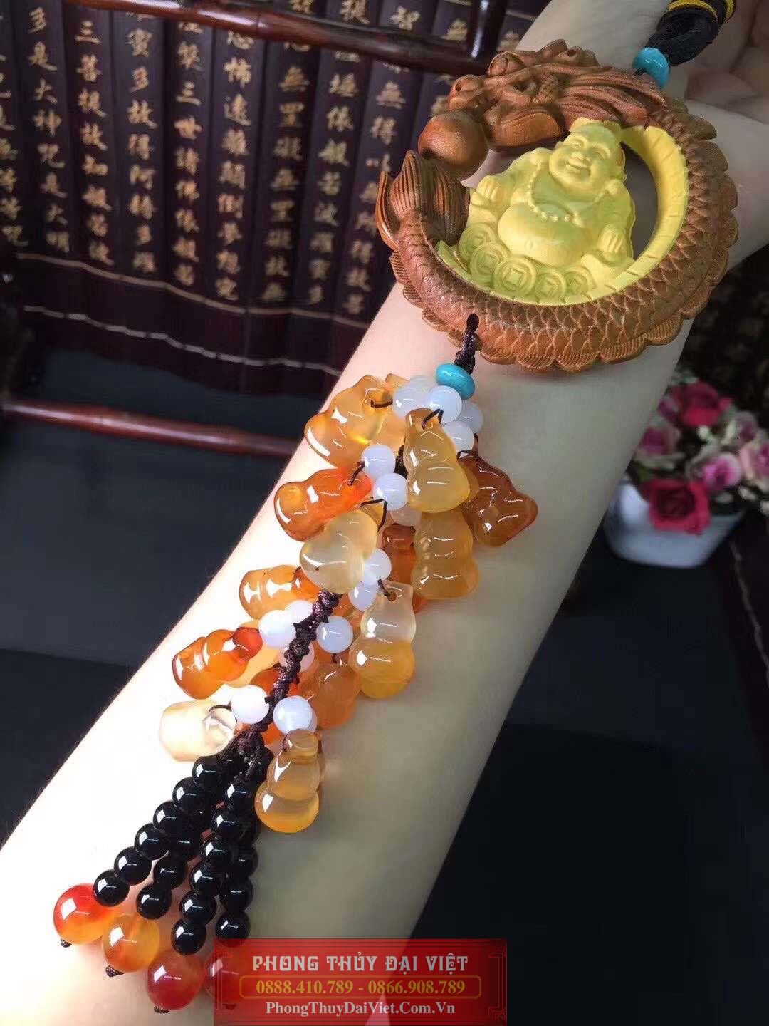 Dây treo phong thuỷ Phật từ gỗ hoàng dương với nhiều hồ lô làm từ đá mã não và các sợi tua rua rủ xuống là vật phẩm mang nhiều ý nghĩa.