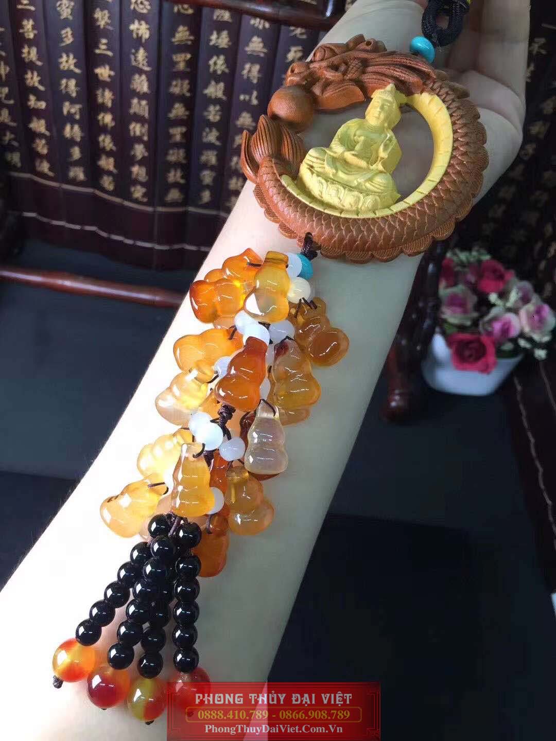 Dây treo phong thuỷ Phật từ gỗ hoàng dương với nhiều hồ lô làm từ đá mã não đỏ và các sợi tua rua rủ xuống là vật phẩm mang nhiều ý nghĩa.