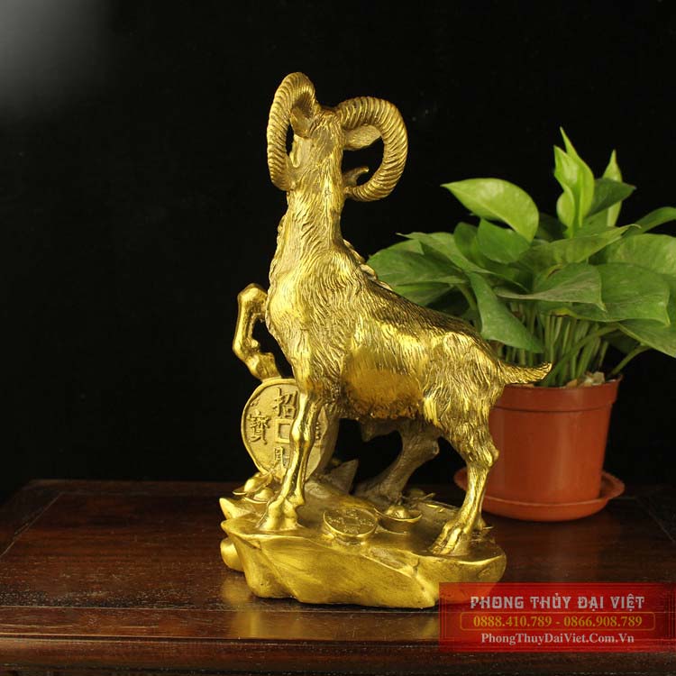 Sản phẩm là hình ảnh chú dê đứng hiên ngang trên phiến đá. Dê với cặp sừng chắc khoẻ uốn cong hình trôn ốc độc đáo thể hiện sự dũng mãnh, khoẻ mạnh. Miệng ngậm dây tiền xu dài vắt sang bên hông. Bộ lông dài, mượt rất chân thực. Chân trước của chú gác lên đồng tiền xu lớn được chạm nổi bốn chữ Hán có nghĩa Chiêu Tài- Tấn Bảo. Không những vậy phiến đá mà chú đứng có rất nhièu tiền, vàng. Tất cả đường nét đều được các nghệ nhân thể hiện rất tỉ mỉ, chi tiết và sống động.