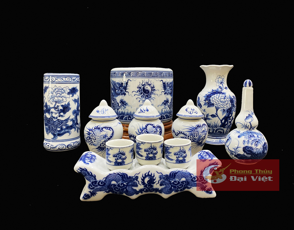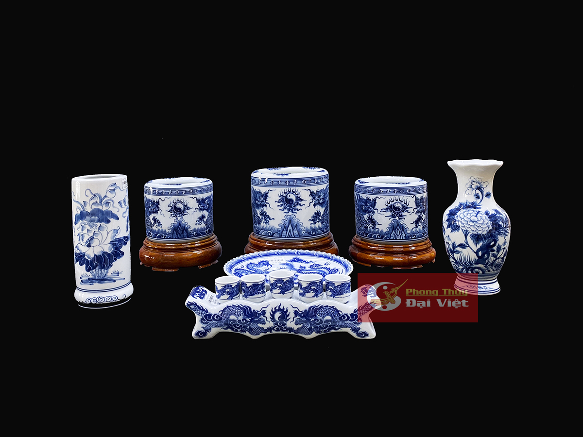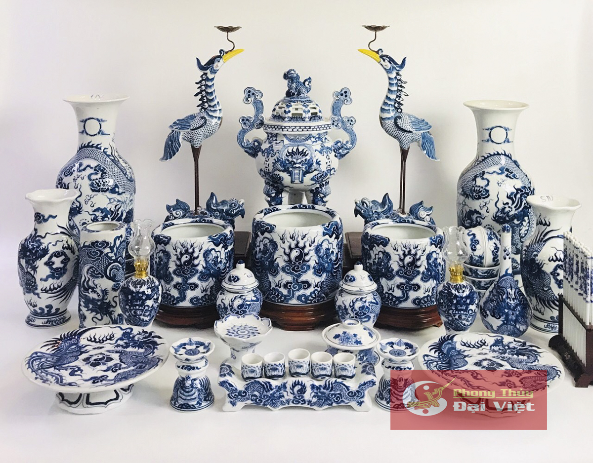 Bên cạnh đó là đồ thờ Bát Tràng được làm từ men lam truyền thống với hình thức vô cùng bắt mắt