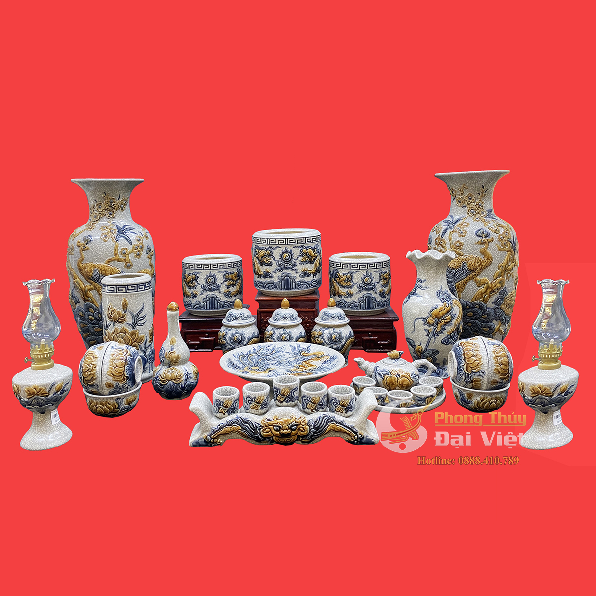 Đồ thờ Bát Tràng làm từ men rạn có các phụ kiện cơ bản như: Bát thờ, đèn dầu, lục bình, mâm bồng,...