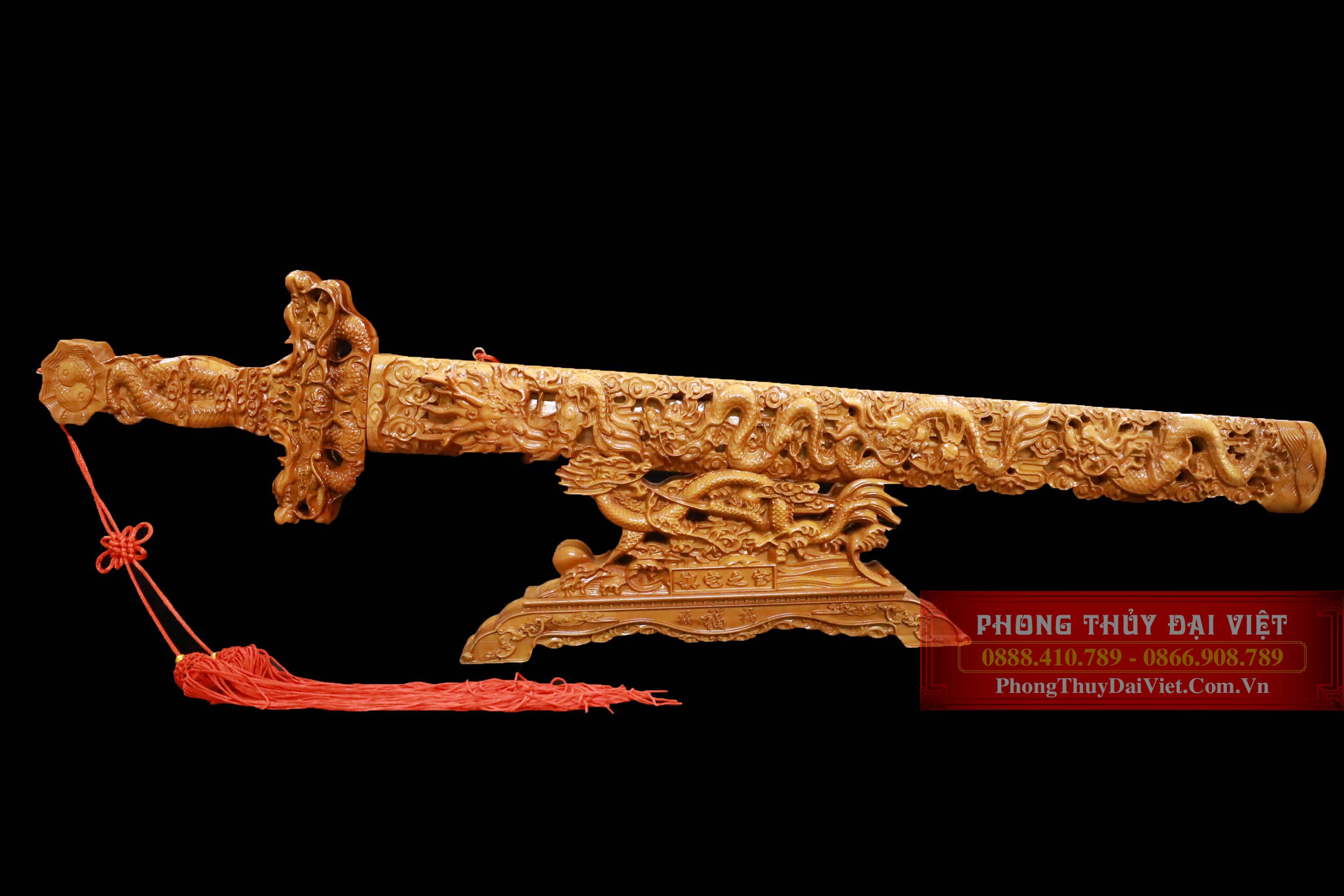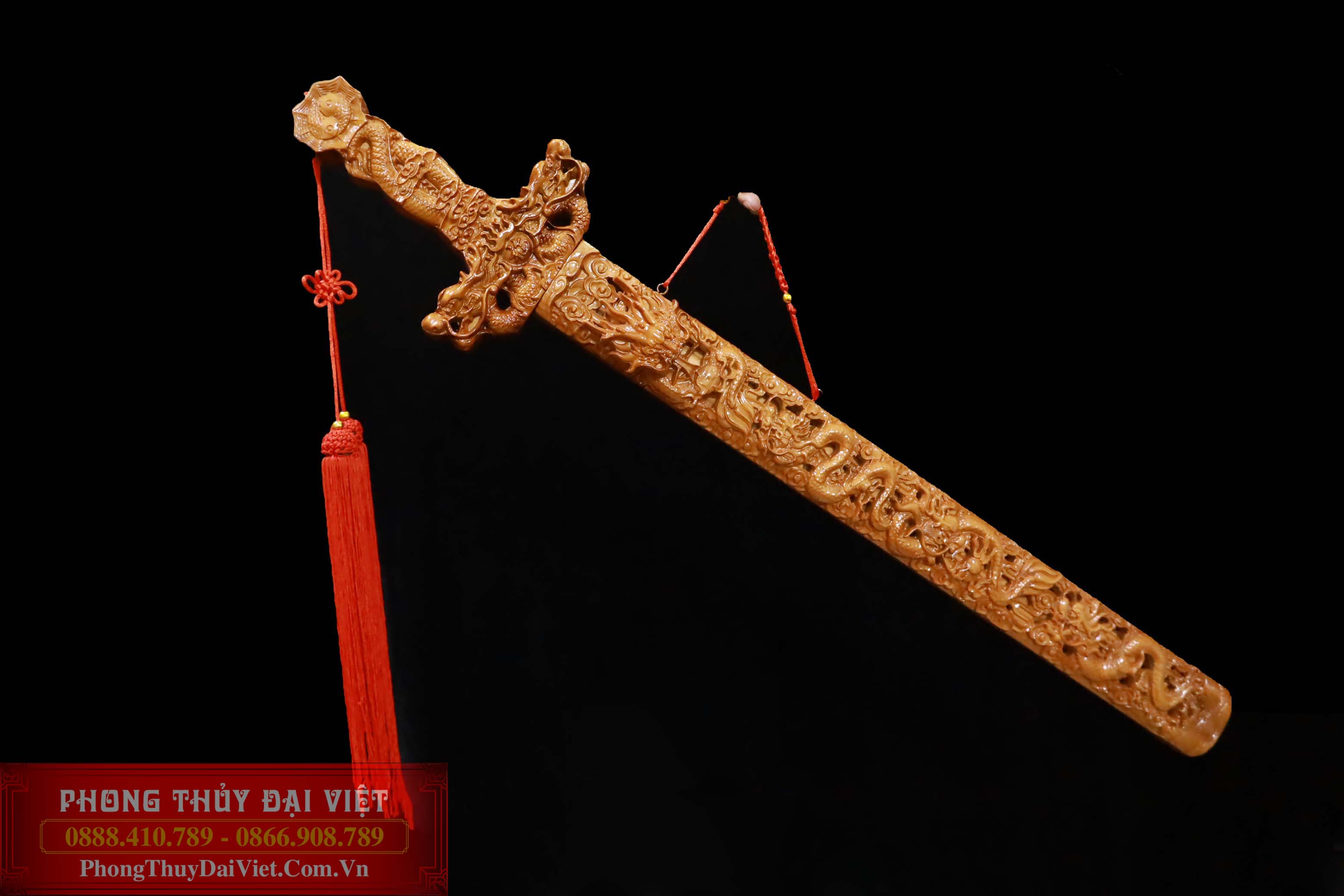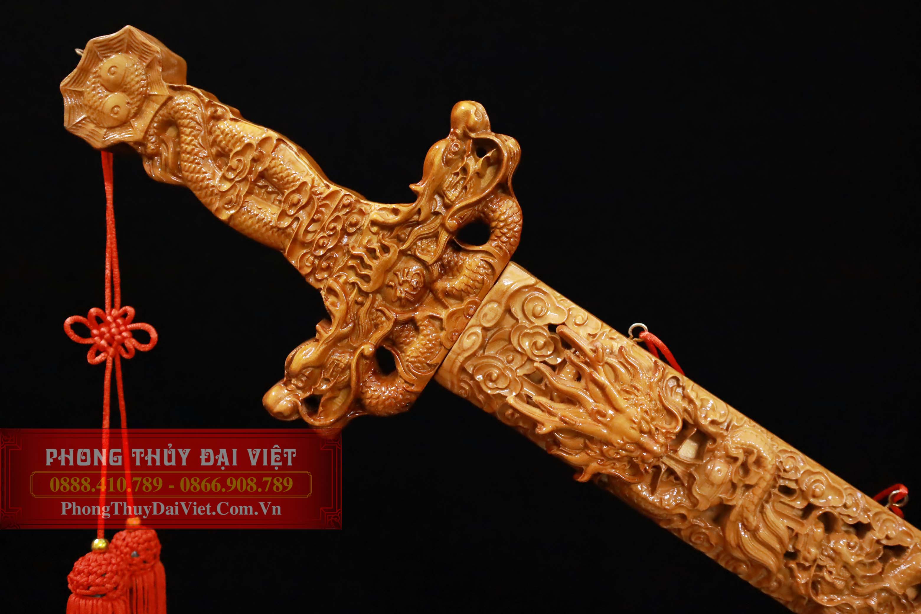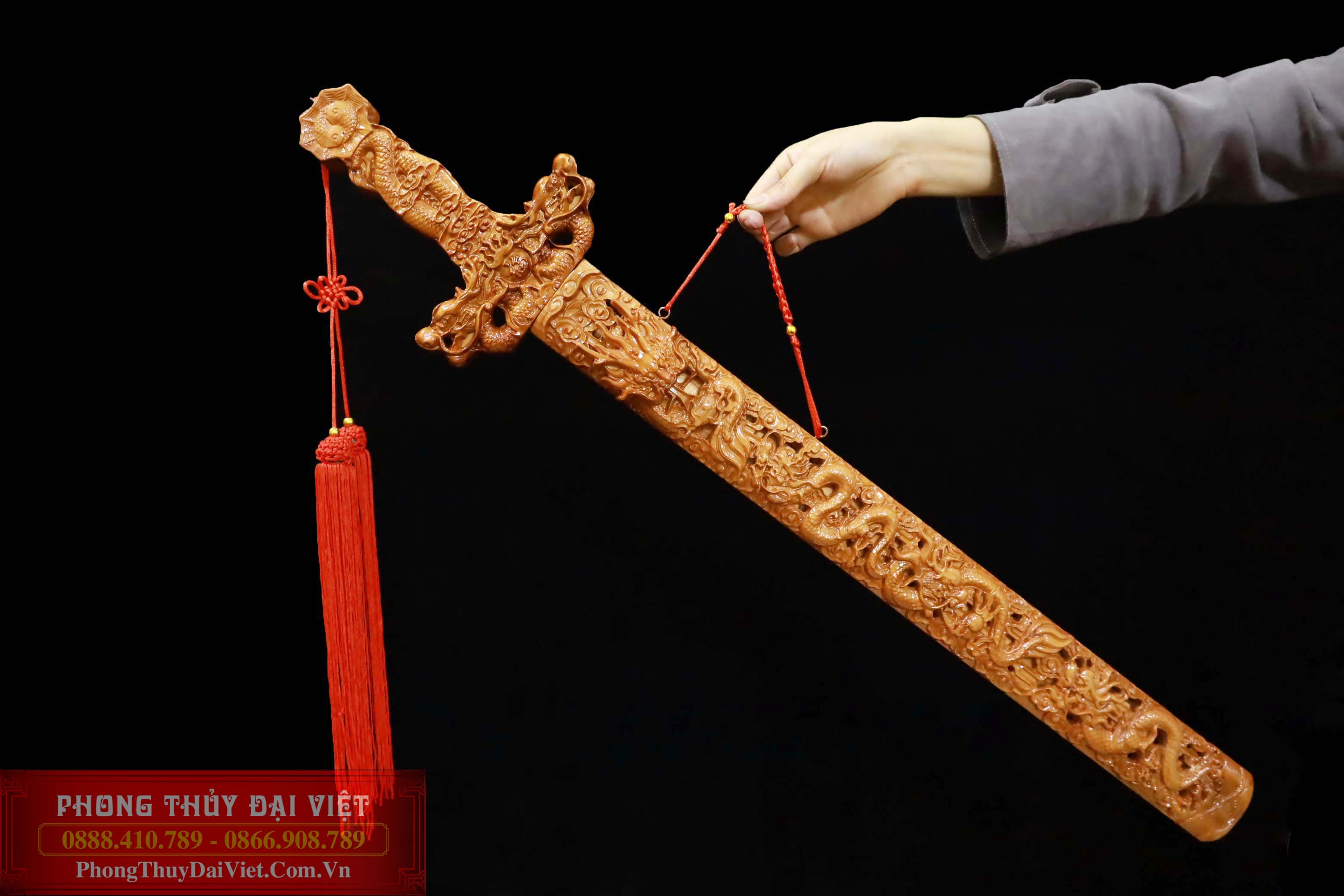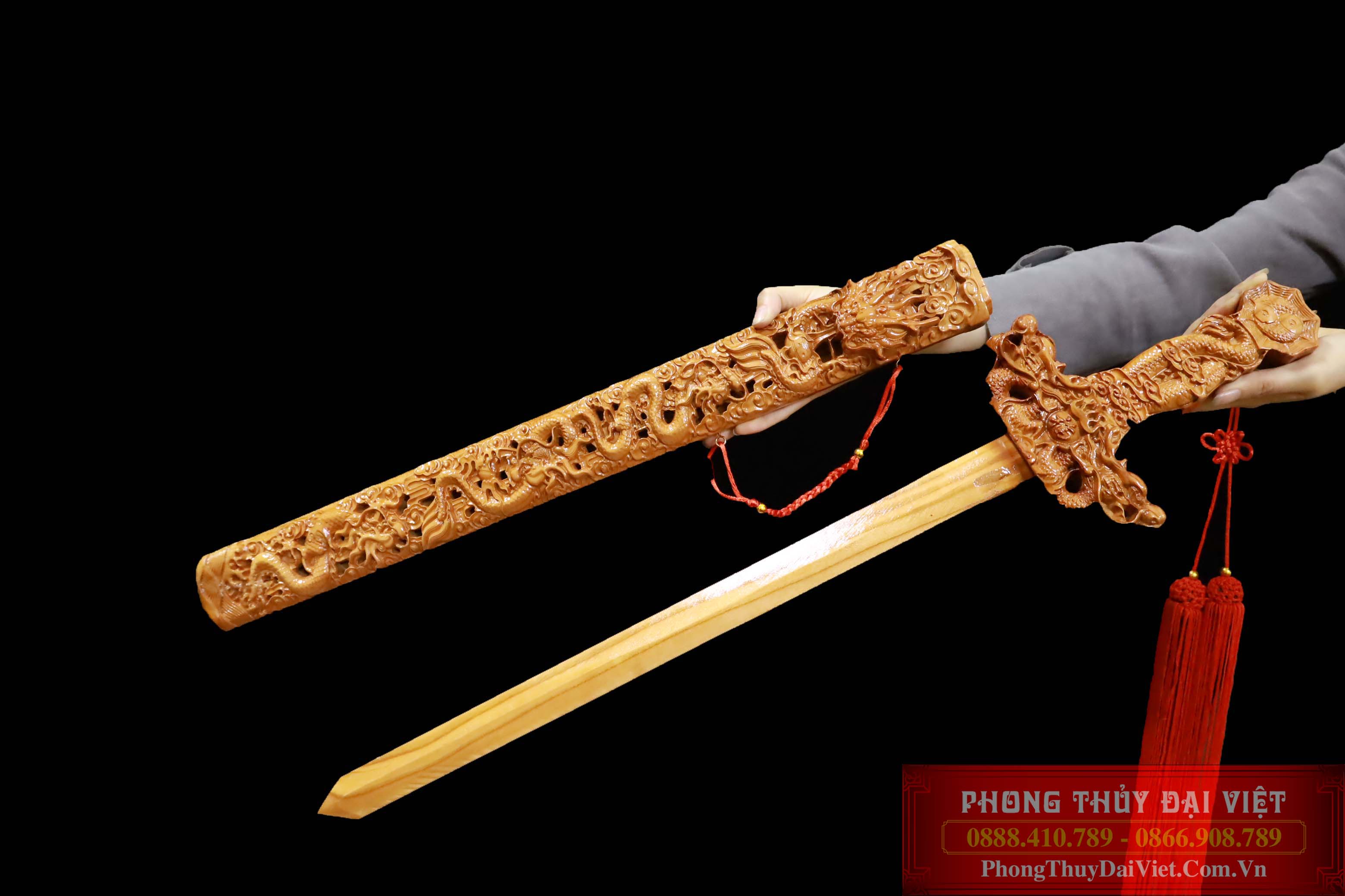 Kiếm gỗ đào được làm từ Gỗ Đào ( loại cây chuyên dùng để trừ tà ma ), kiếm được điêu khắc hình rồng có công dụng trấn tà, mang lại bình an may mắn cho gia chủ.