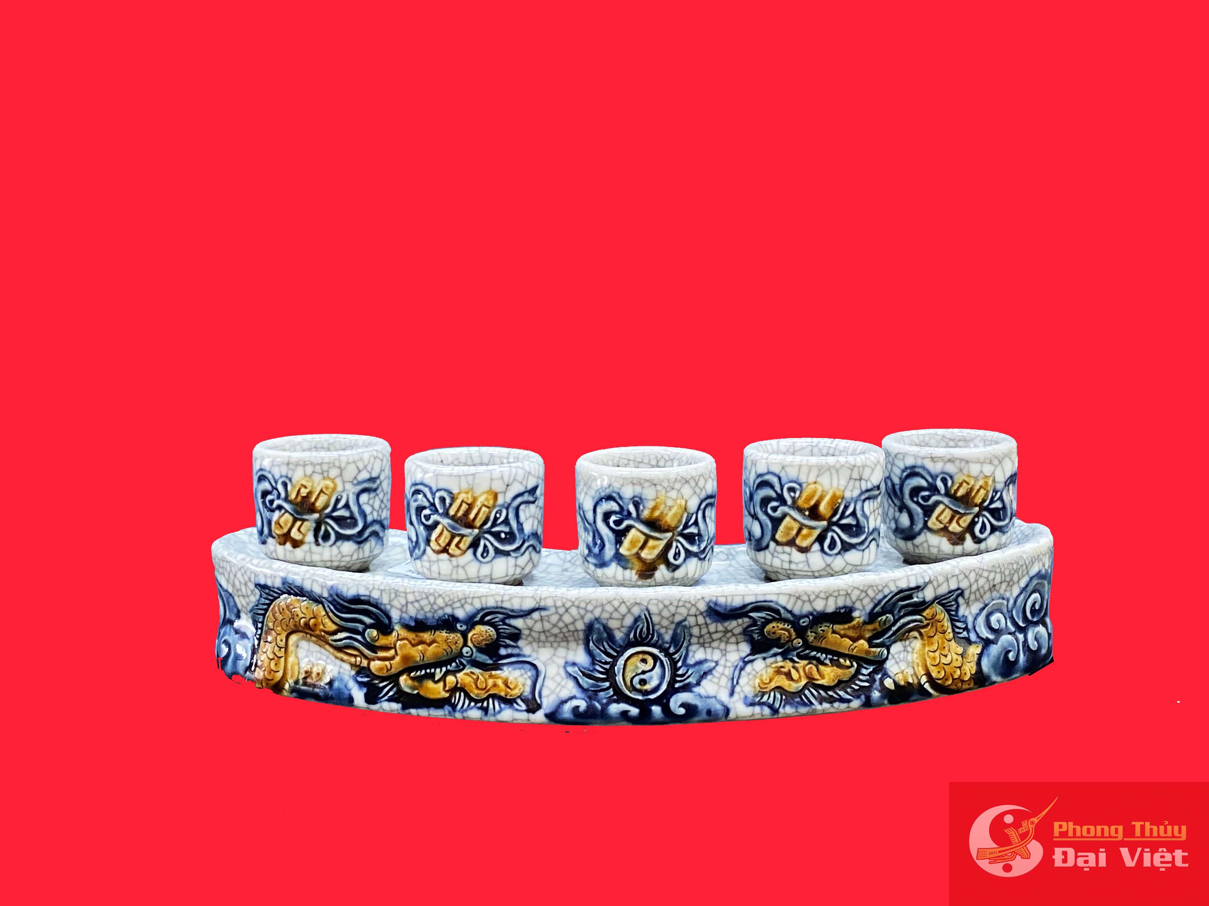 Kỷ ngai cong 5 chén vẽ rồng men rạn
