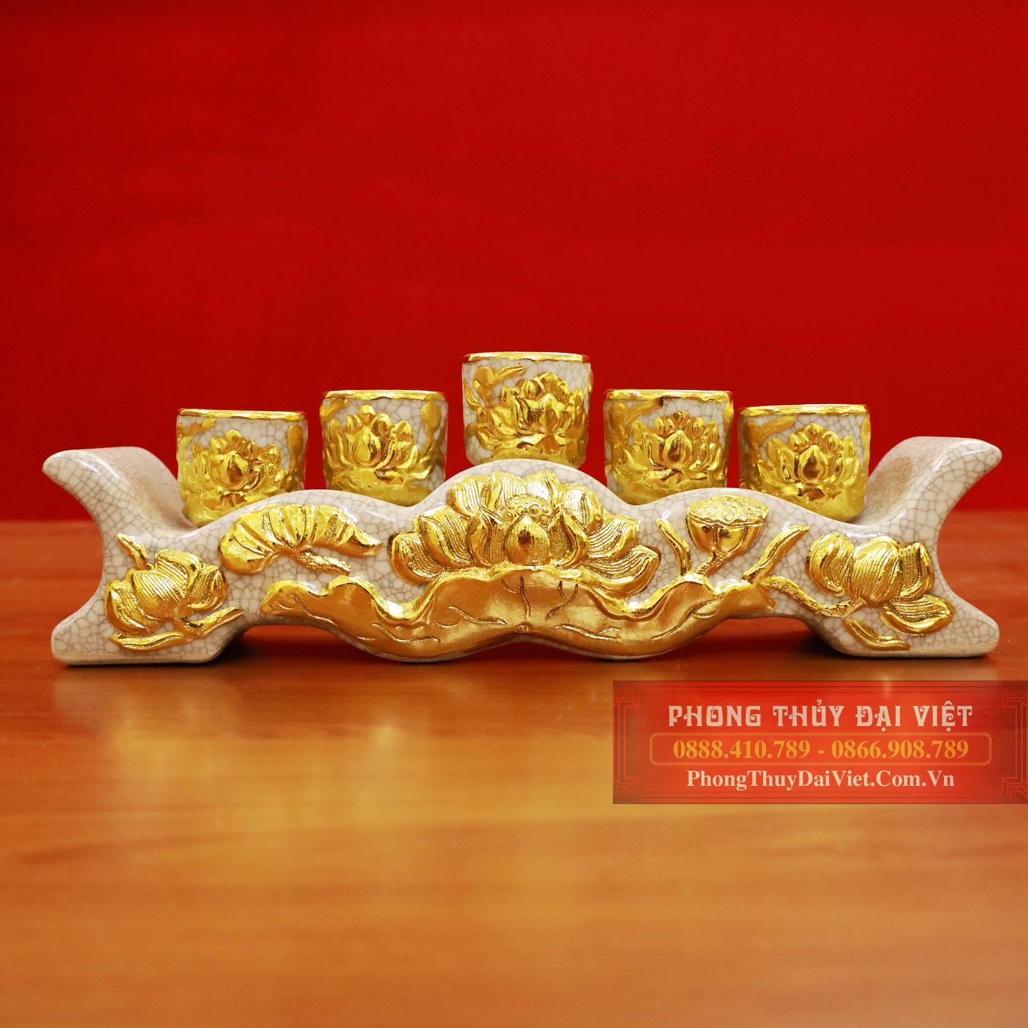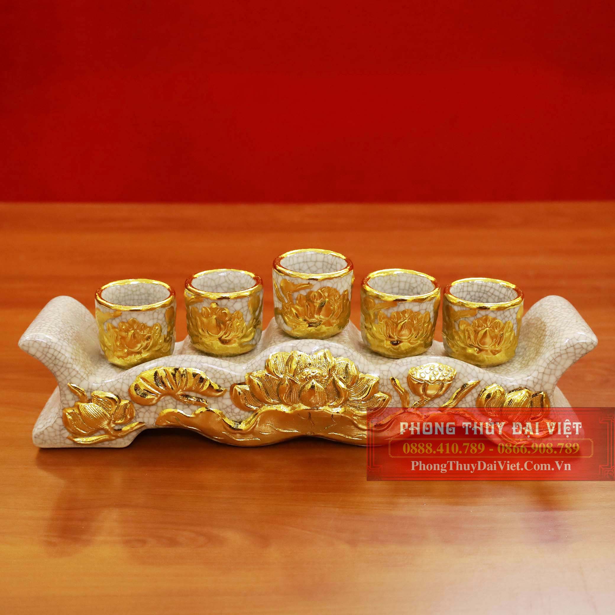 Bộ kỷ ngai 5 chén sen men rạn đắp nổi dát vàng 24k cao cấp