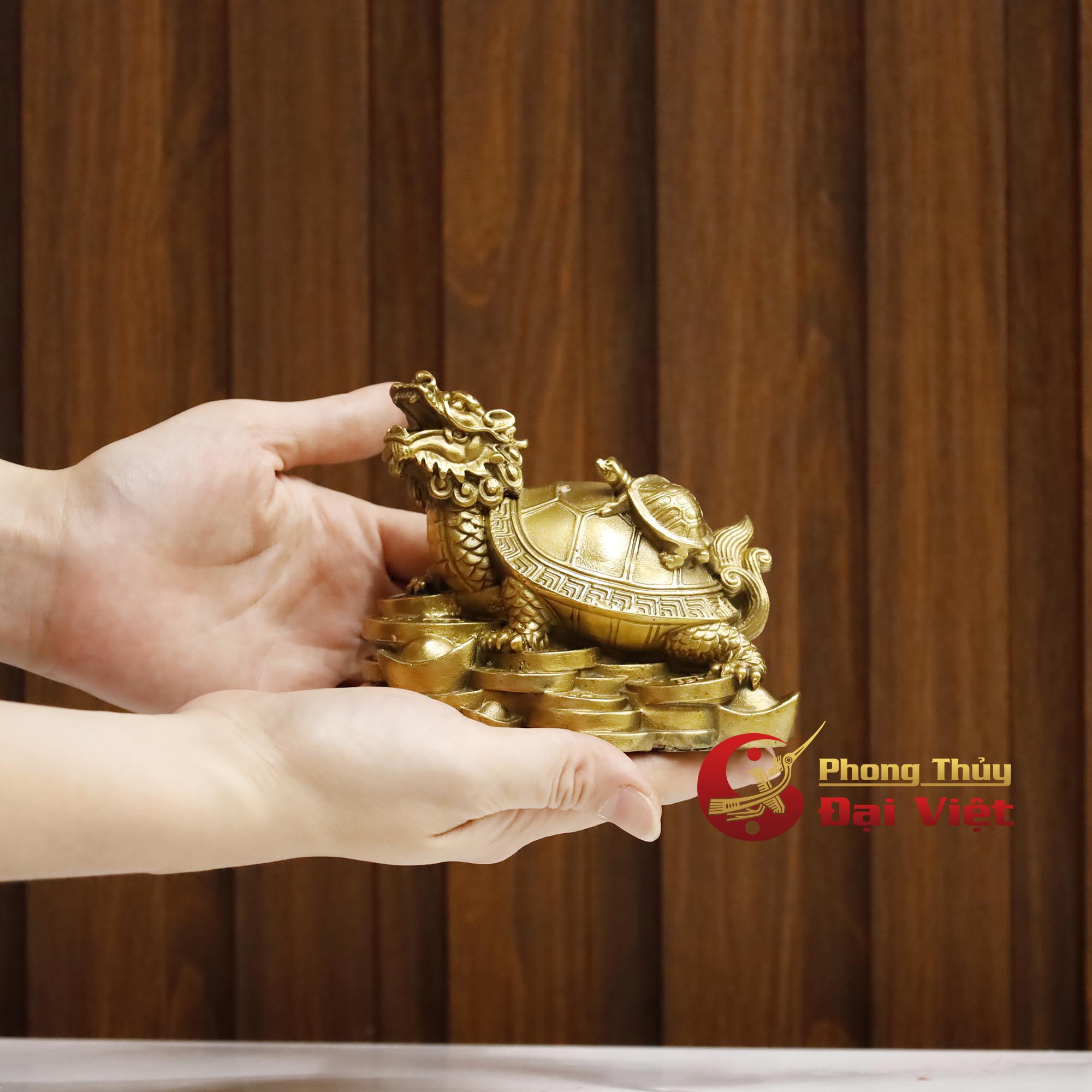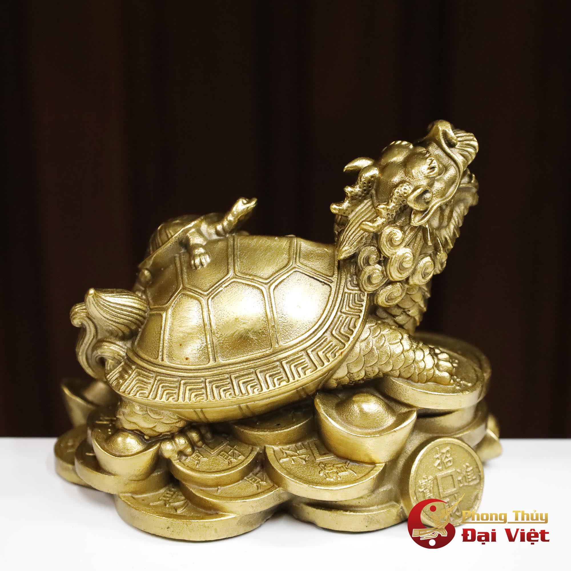 - Với hình ảnh đầu rồng ngẩng cao, miệng há rộng oai phong, dũng mãnh. Trên lưng cõng rùa con, chân đạp trên núi tiền vàng. Sản phẩm được thể hiện vô cùng sắc nét, tinh xảo.