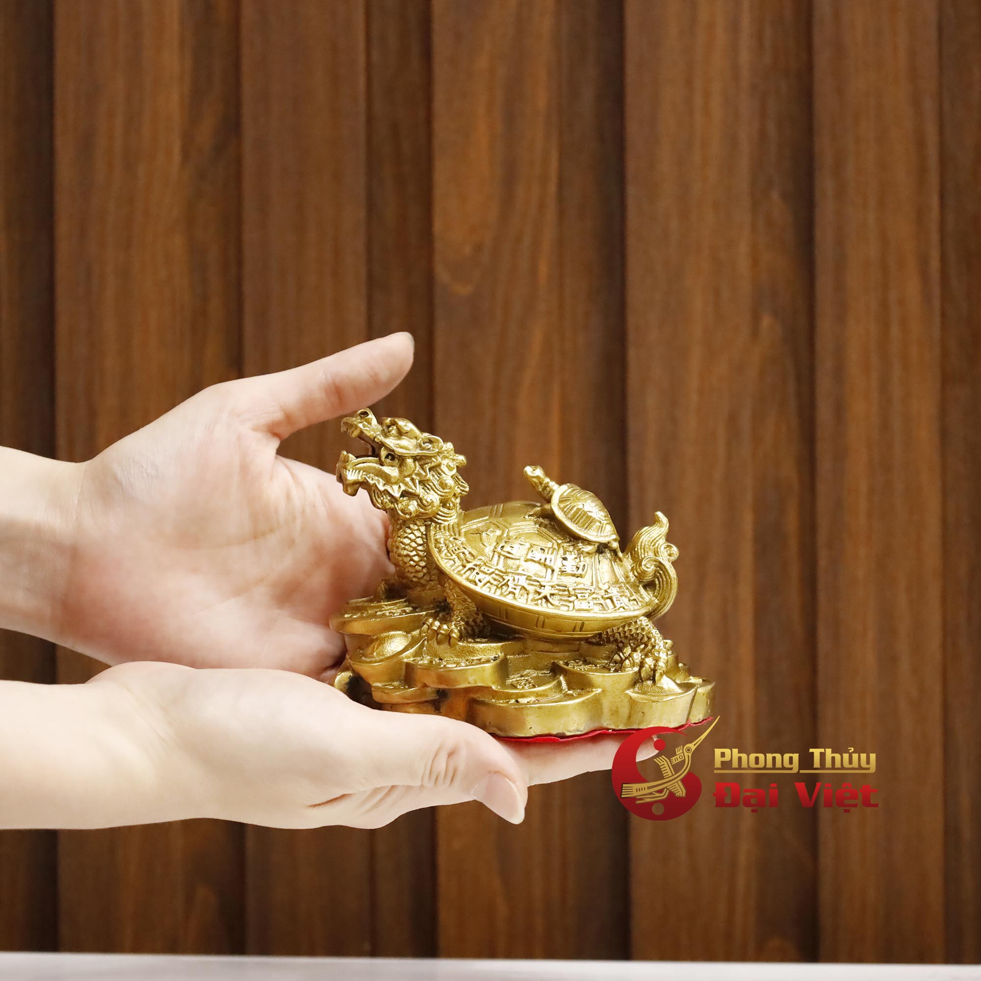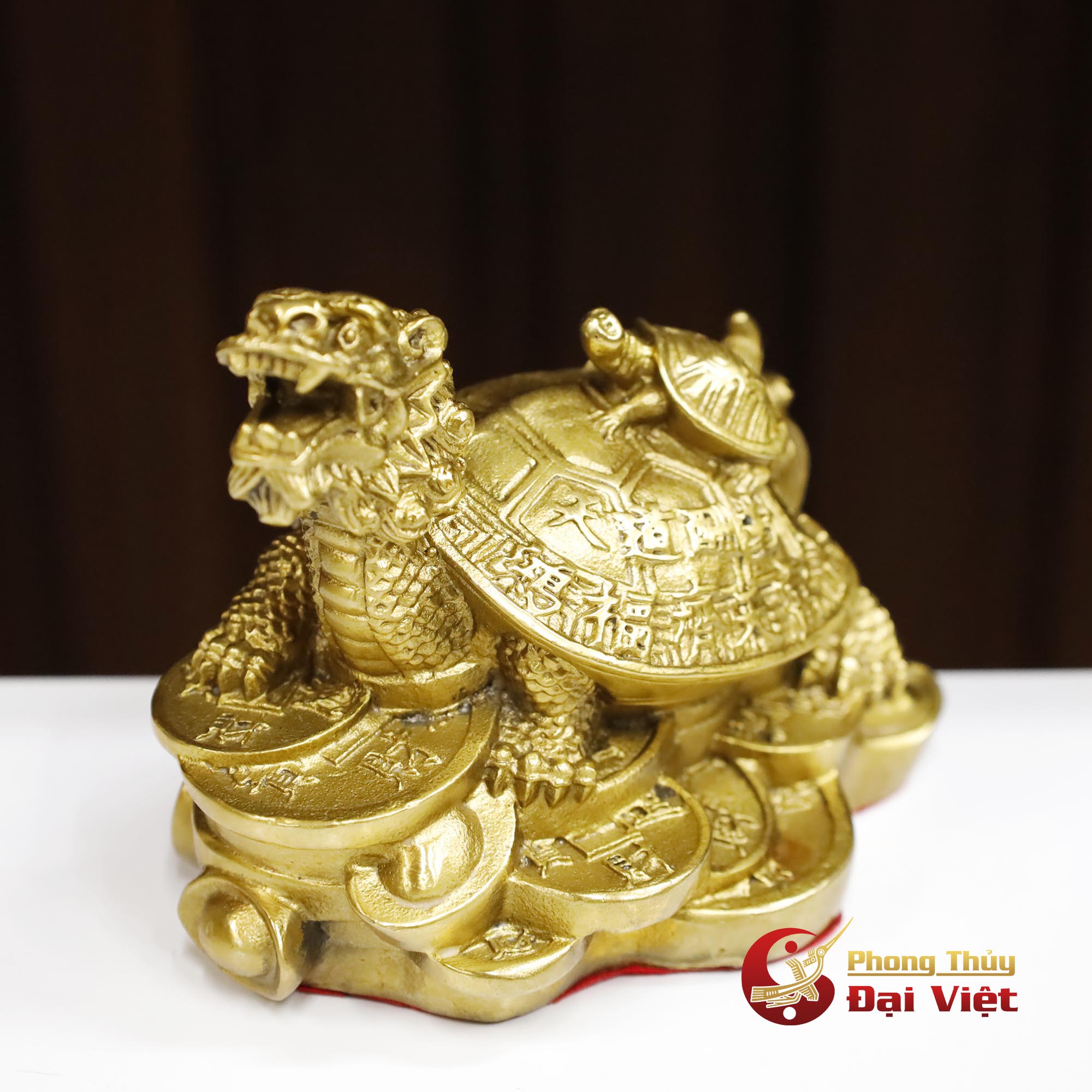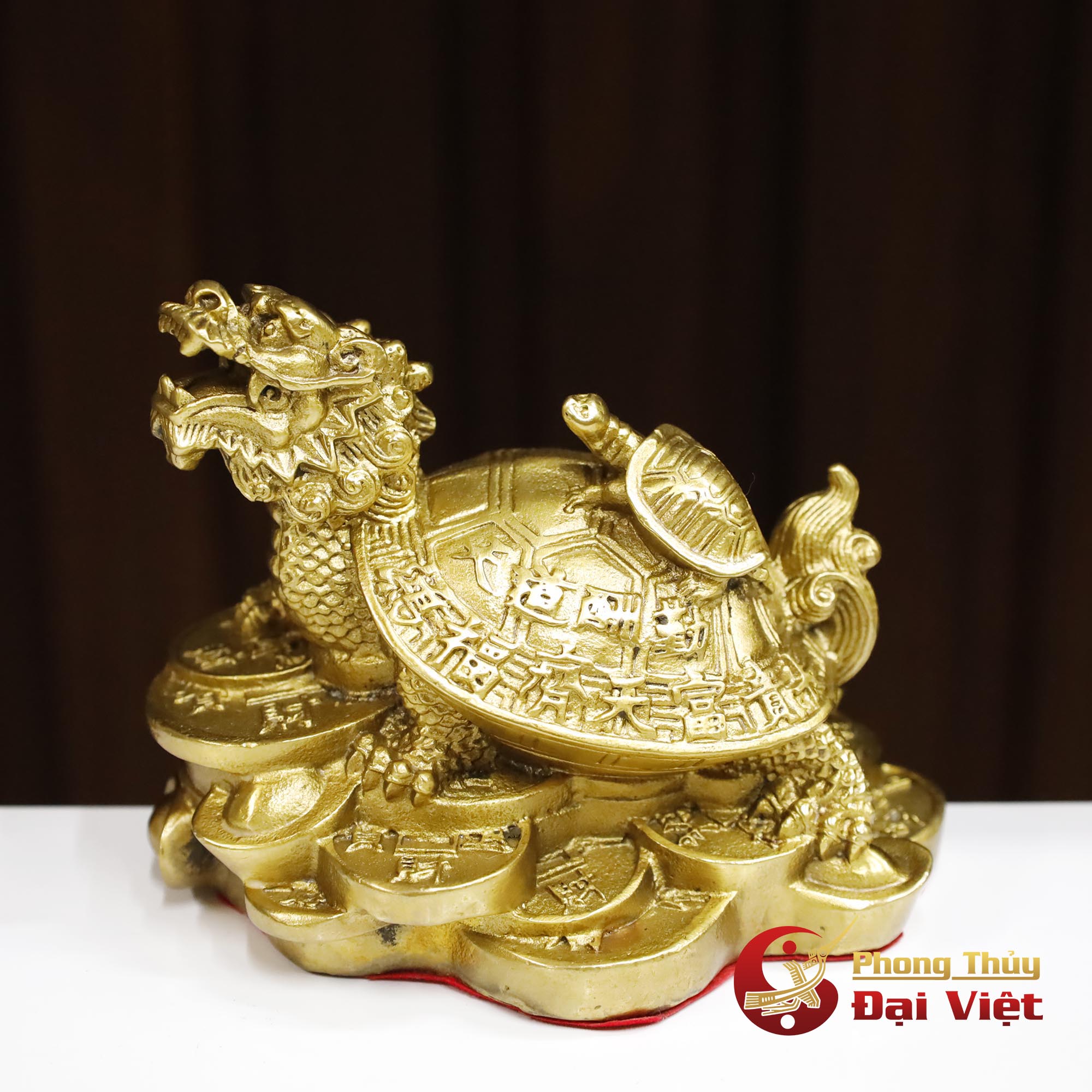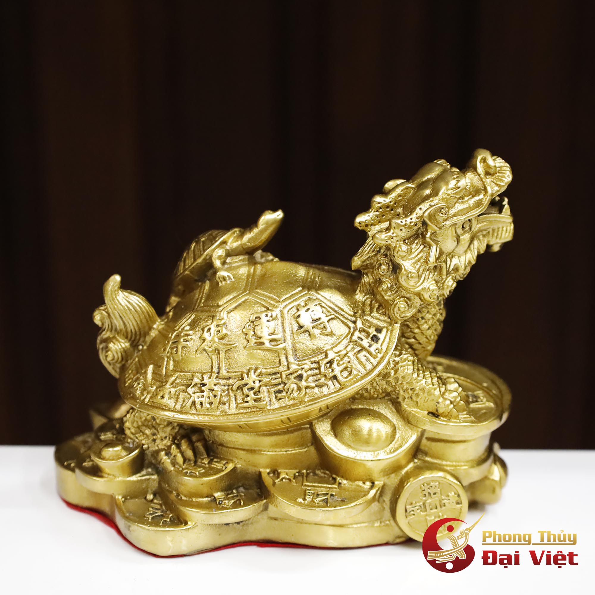 - Với hình ảnh đầu rồng ngẩng cao, miệng há rộng oai phong, dũng mãnh. Trên lưng cõng rùa con, chân đạp trên núi tiền vàng. Sản phẩm được thể hiện vô cùng sắc nét, tinh xảo.