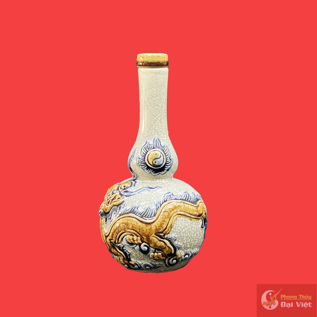Nậm rượu hai bầu men rạn đắp nổi hình rồng độc đáo, đẹp mắt có đường nét rõ ràng, dứt khoát nhưng vẫn tỏ ra được vị thế oai hùng của con vật đứng đầu trong 4 tứ linh. Sản phẩm thiết kế để đựng rượu được bày biện trên ban thờ, giúp cho không gian thờ tự thêm ấm cúng, trang nghiêm.