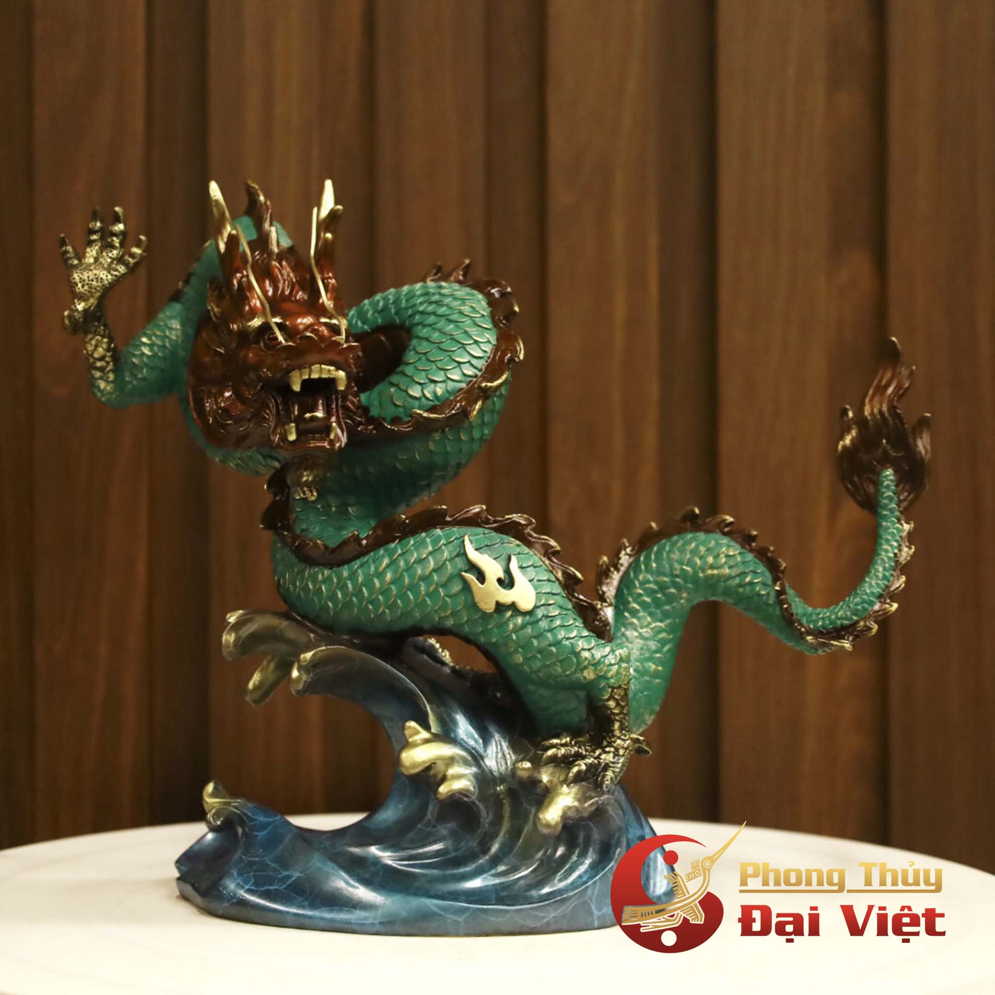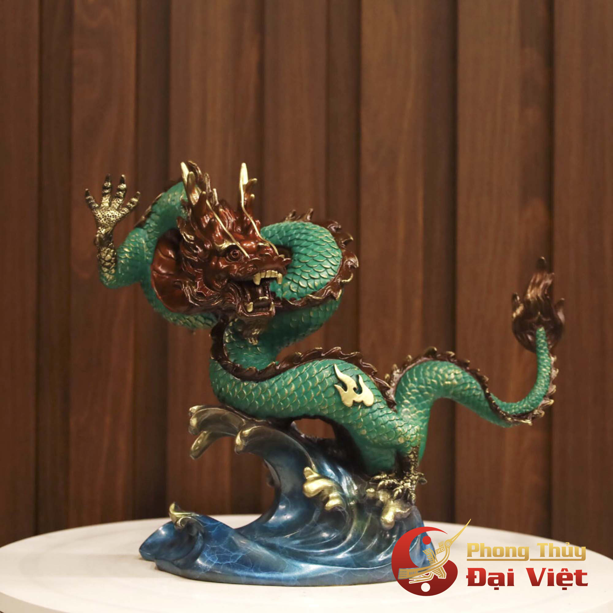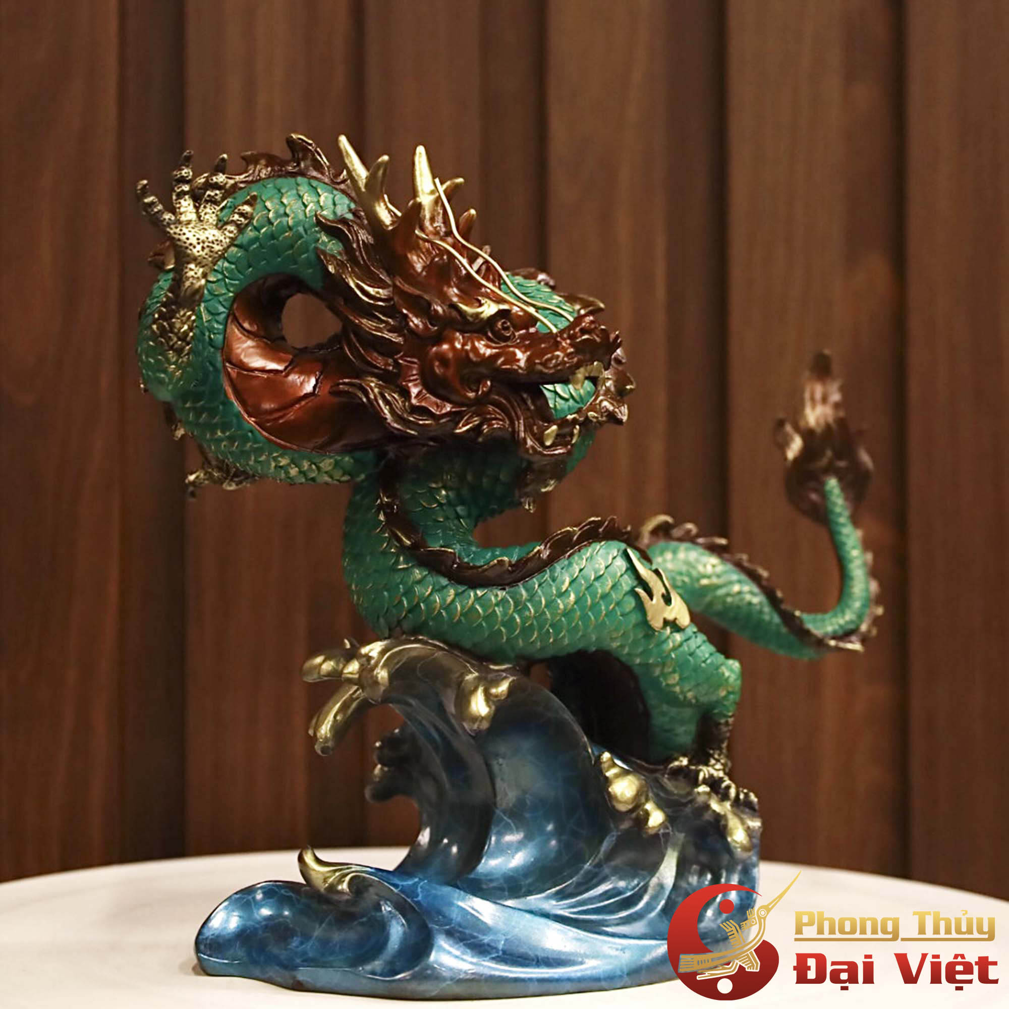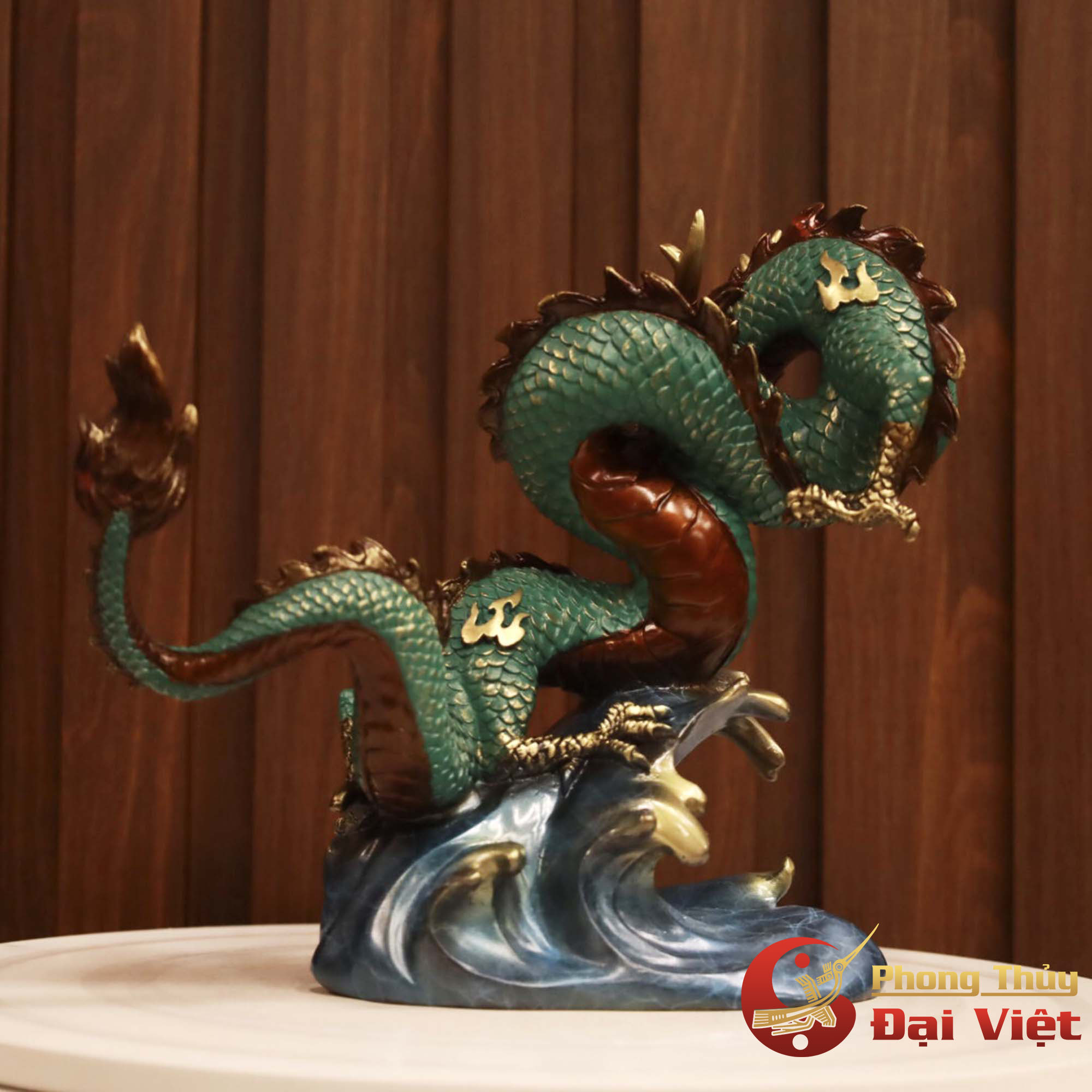 Tượng rồng xanh cưỡi sóng là biểu tượng mạnh mẽ của quyền lực, trí tuệ và thành công vượt bậc. Rồng vốn là linh vật tối cao trong văn hóa phương Đông, đại diện cho vua chúa và những người có khả năng lãnh đạo. Hình ảnh rồng đang cưỡi sóng thể hiện sự vượt qua thử thách, làm chủ nghịch cảnh, mang đến thành công rực rỡ cho người sở hữu.